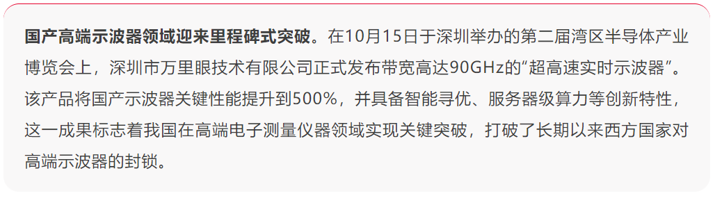 万里眼发布90GHz超高速实时示波器 此次发布的产品性能指标全球领先。除90GHz带宽外,其采样率达每秒2000亿次,可精准捕获皮秒级瞬态信号;存储深度达40亿样点,为同级别产品两倍,支持连续无间隙记录复杂信号。 在智能化方面,万里眼全球首创“智能参数寻优”功能,通过专用模型可在10分钟内遍历万种配置,将其测试效率提升百倍以上。其独创的“慧眼架构”首次在示波器中集成服务器级算力,32核通用处理器性能为业界标准4倍,并支持高达300+ TFLOPS的AI算力与云端扩展。 该示波器也是业内首款全面屏设备,采用18.5寸超大面积屏幕,通过多指触控实现“终端级”交互体验。发布仪式获得中国计量科学研究院信息电子所所长兼亚太计量组织APMP电磁委员会主席崔孝海、中国移动研究院测试中心副总经理杨海俊、上海交通大学集成电路学院副院长诸葛群碧、华为集群计算总经理朱照生等行业专家共同见证,被业界视为构建“中国标尺”的关键进展。 万里眼2025新品发布仪式 高端示波器是半导体、通信等产业的基础工具,科技进步高度依赖于关键测试测量技术的突破,没有测量就没有科学。此前,中国市场长期受西方出口管制制约,带宽60GHz以上的实时示波器被禁止进入中国,部分单位甚至无法获取20GHz以上设备。万里眼公司CEO刘桑表示,万里眼始终秉持“智测世界,洞见未来,助力科技与产业持续进步”的愿景和使命,聚焦电子基础测量仪器、射频微波测量仪器及网络测试仪器三大产品线,致力于突破关键技术,研发高端产品,提供创新测试解决方案。